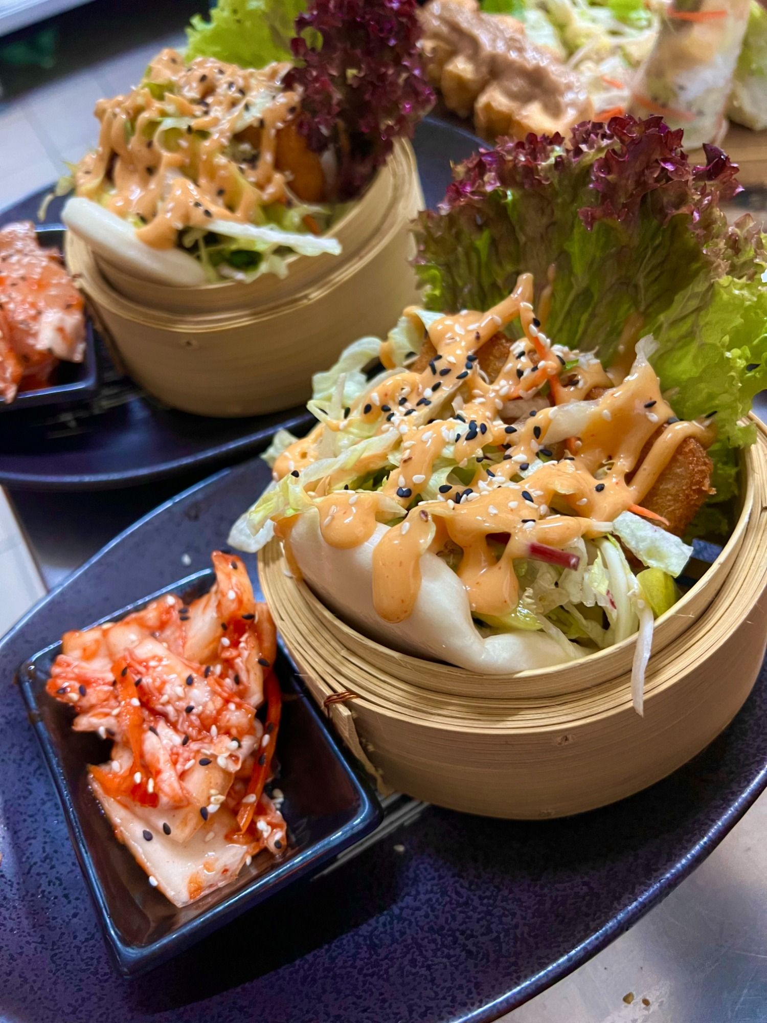 Vorspeise Platte aus Kimchi, mini Frühlingsrollen, Knusprige Wantans, Knusprige Tofuspiesse, gedämpfte Teigtaschen, dazu 3 Soßen ( Erdnuss, soja, sauer scharf ) (S,G,W,N,M)