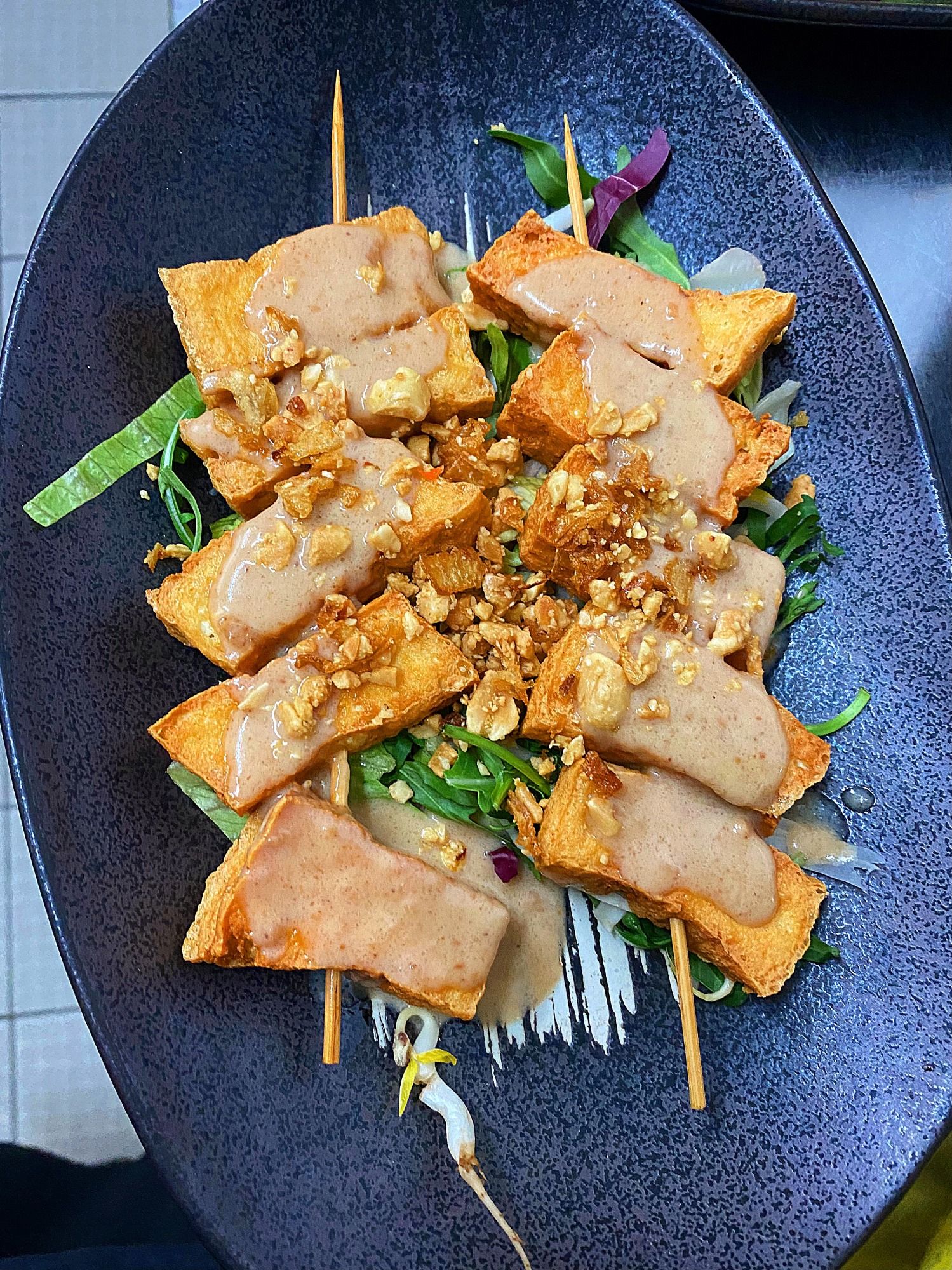 Gebratene Tofu mit Chilli Zitronengrass dazu frischem Salat in hausgemachte Soja Limetten Soße und Erdnüsse & Röstzwiebeln dazu Reis